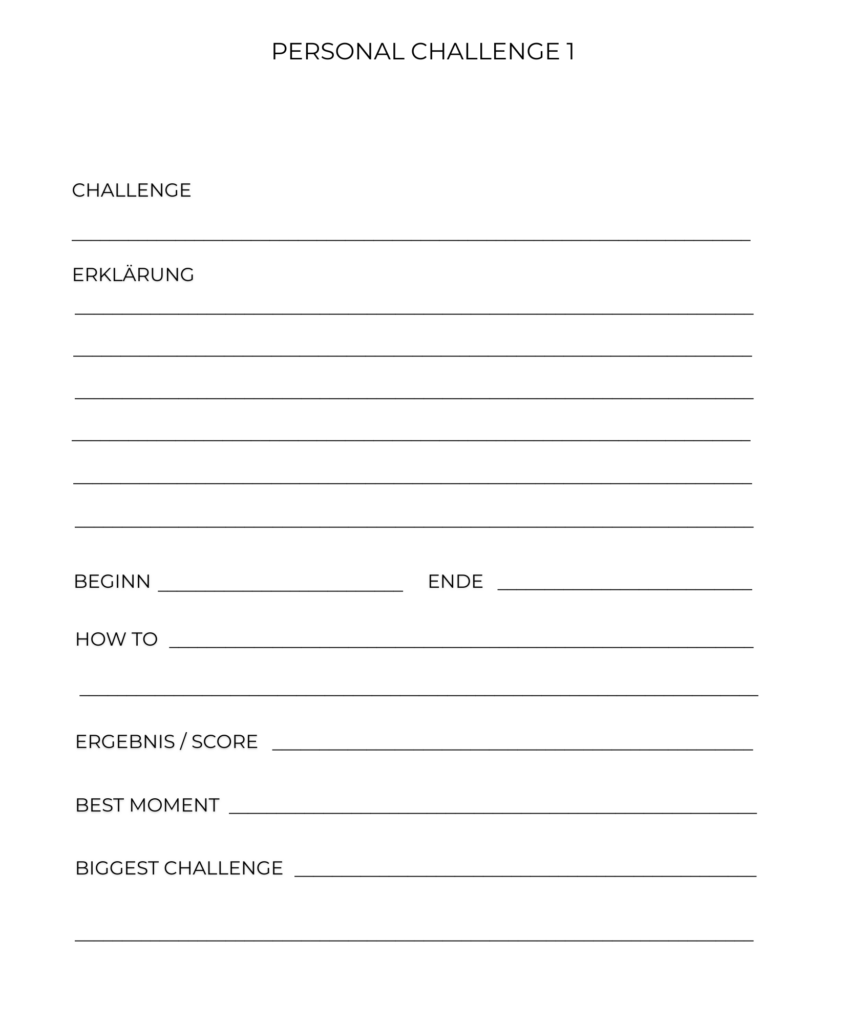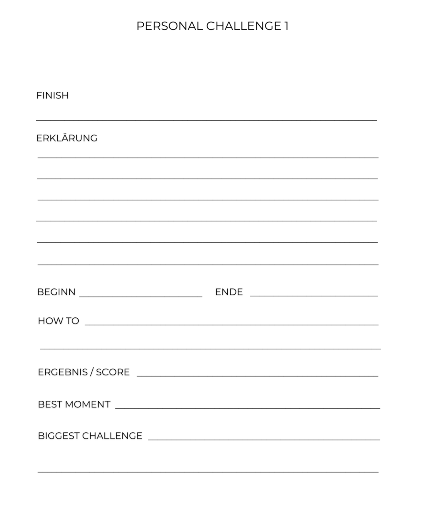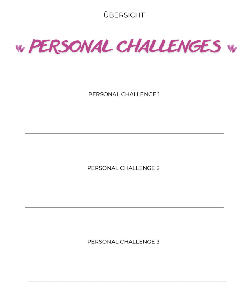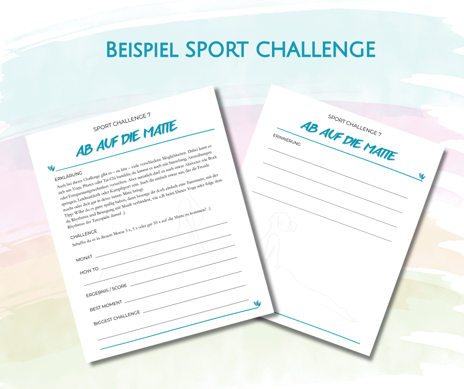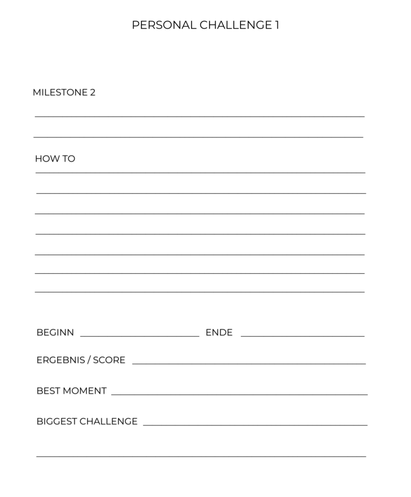 Als besonderes Highlight bietet dieses Buch noch eine Anleitung für besonders persönliche bzw. größere Challenges, die nicht so einfach in einem Monat erledigt werden können 😉 Hier kannst du jedoch deine PERSONAL CHALLLENGE in drei Meilensteinen bis zum Finish planen – und durchziehen! Natürlich ebenfalls mit Erinnerungsseiten für jeden Abschnitt, den du geschafft hast 🙂
